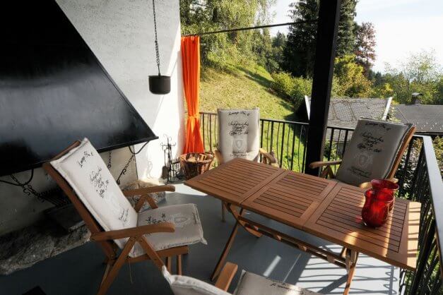 Balkon mit Sitzplatz, Außenkamin (Kaminholz zur freien Verfügung) und Weber-Gas-Grill